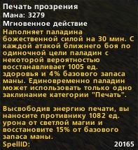 3. " Высвободив энергию печати,вы наносите противнику (1 + 0.25 * holy spell power.16 * AP) ед. урона от светлой магии,и восстановите 15% от базового запаса манны."