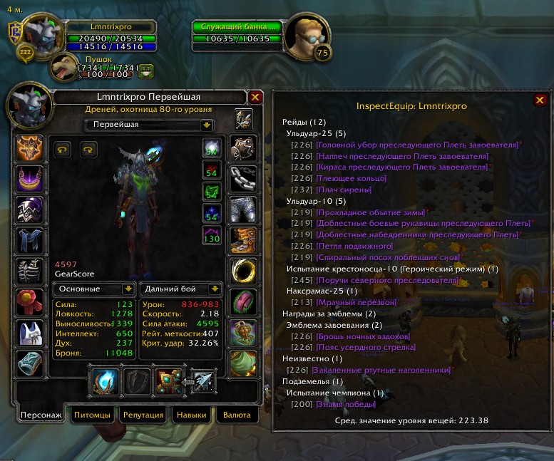 2. Хант с тайтлами Первейший,Герой Нордскола, Неумирающий и т.д, бис PVE, собран шмот на ПТ( не хватает только наручей ) есть PVP шмот, ноги а8 х2 остальное а7, есть некоторый дабл офф сет включая кольцо с РС, имеется так же 19 коинов и пухи за коины на транс, из маунтов есть Непобедимый, Драконы за СРЛК и СРУ, все остальное смотрите в банке