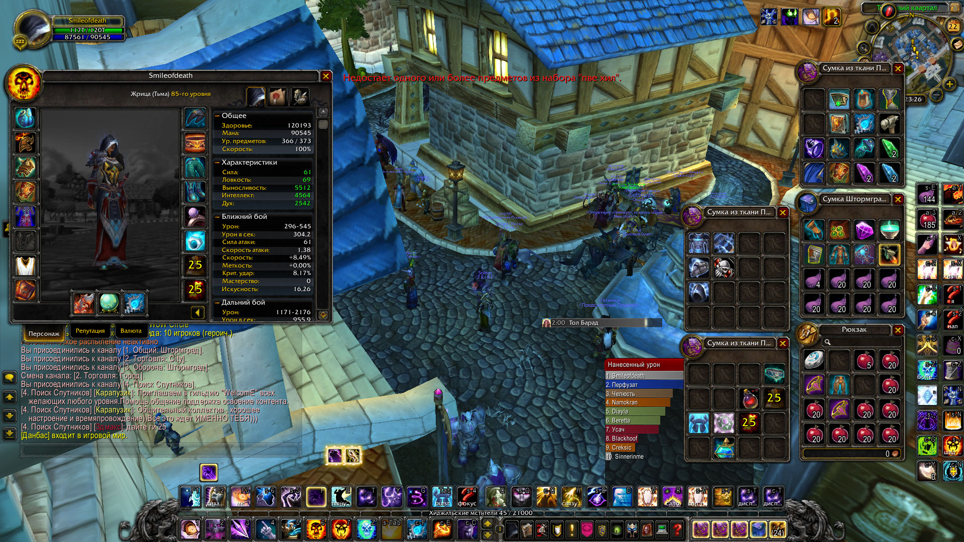 2.Персонаж одет в шп 370 пвп(фул бг+ 1 шмотка арены+в запасе есть 1650 завоевания) и 366 пве(шп/дц).Фул сокеты+ чарки.Пвп вещи лежат в банке(при просмотре в личном кабинете персонажа можно посмотреть в разделе хранилища)