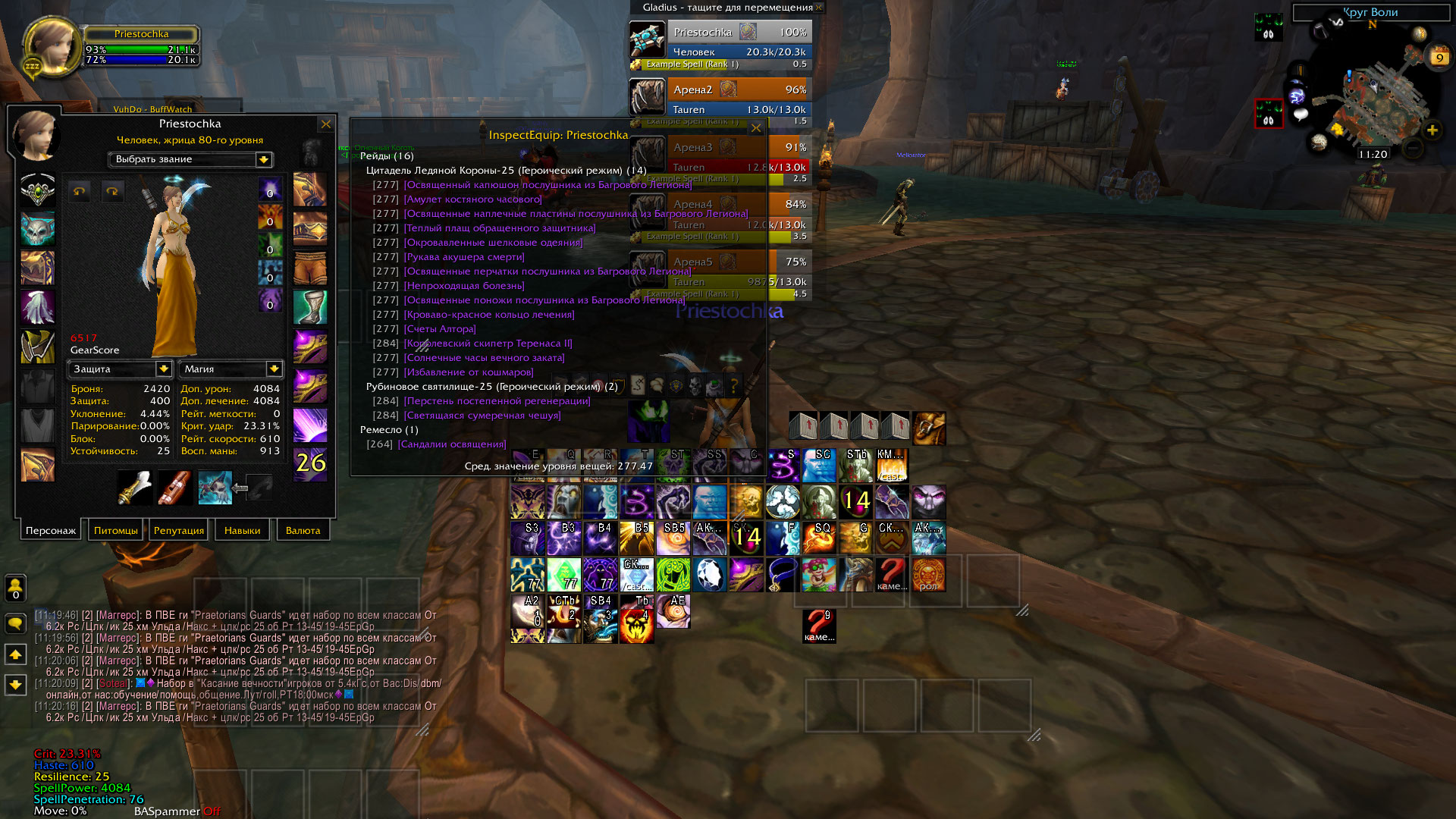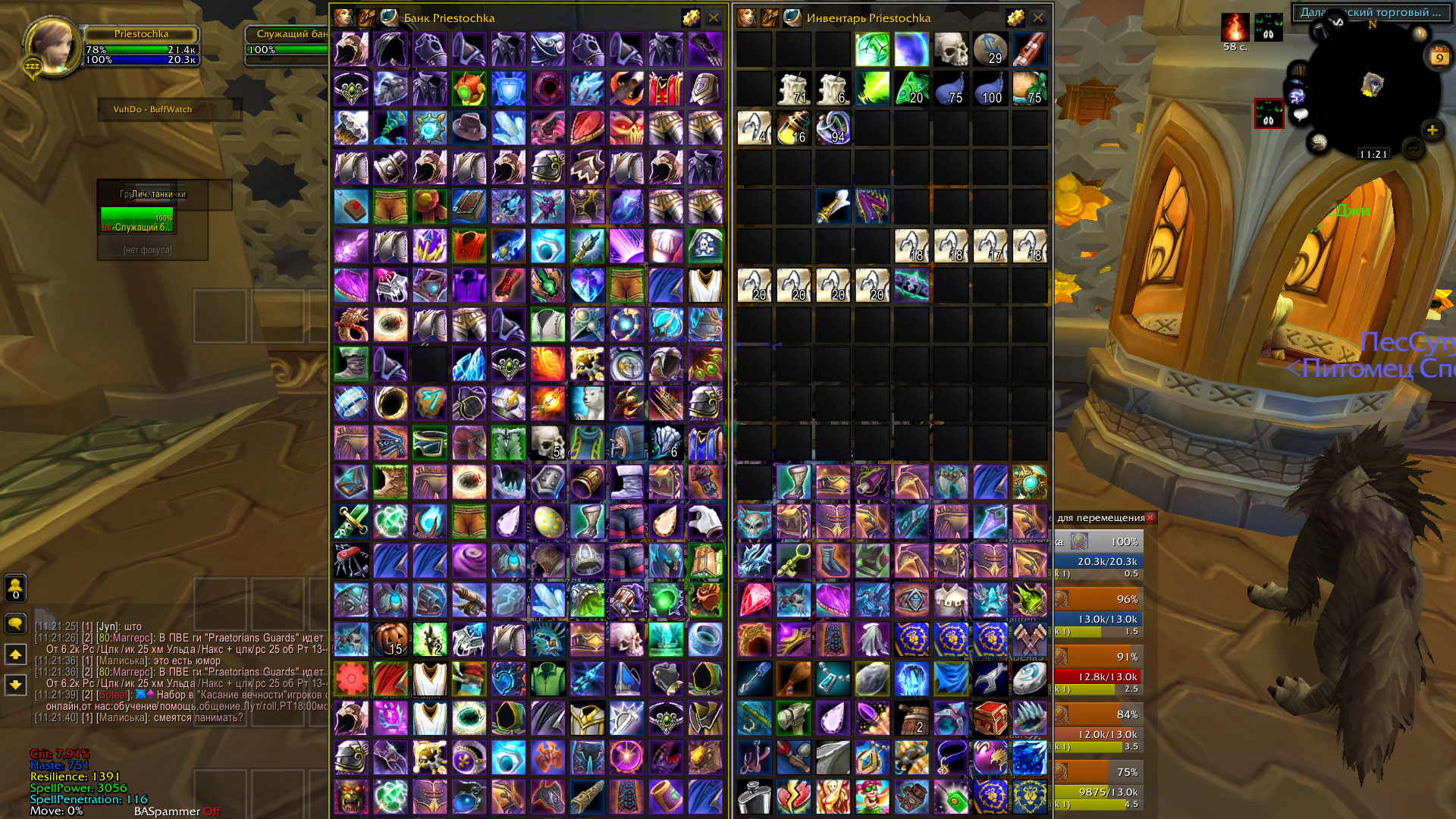 3 - Куча званий, таких как дочь альянса, завоеватель ульдуара и т.д., любые шмотки на все спеки, любые обвесы, куча превращалок, качалок, стрелялок, перделок, телепорталок и тд., шмота столько, что в экран не входит панель Bagdona. (то есть еще ниже за экраном сумки продолжаются!!)