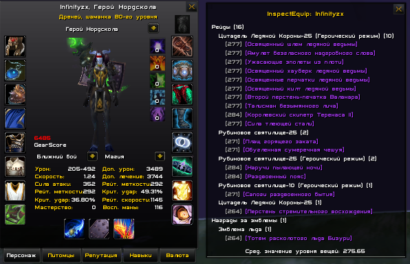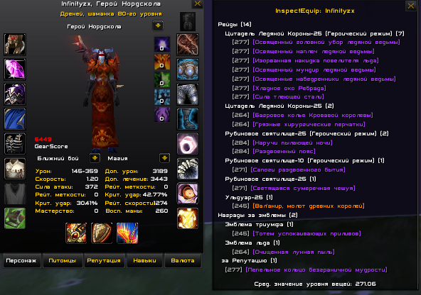 2. Арповый энх 2 до бисса(грудь с кораблей, токен) есть куски на хаст хит сборку(кольцо, плащ), элем 3 до бисса(Кольцо корабли, чешка, ступни), Ршам 6.4+(Есть Валына), в сумках лежат щиты под свап с элема на ршаму. Много разных сетов на транс с Ульды, т3 шамановский донатный, т7(25 Накс), т6, Громовая Ярость, Лыжа, Кальян за коины, Есть рубашка из Праздничного бокса. На чаре есть 27 коинов на ренейм. Из маунтов Непобедимый. Шаман со званиями Герой Нордскола и Завоеватель Наксрамаса. Смотрите сумки, Теренаска лежит в сумке.