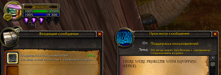 Здравствуйте, всё, что выкладываю на аукцион через какое-то короткое время возвращается в почтовый ящик, с иконкой от Близзард и надписью, что *Эта вещь имеет проблемы с одеванием/хранением в сумке*.