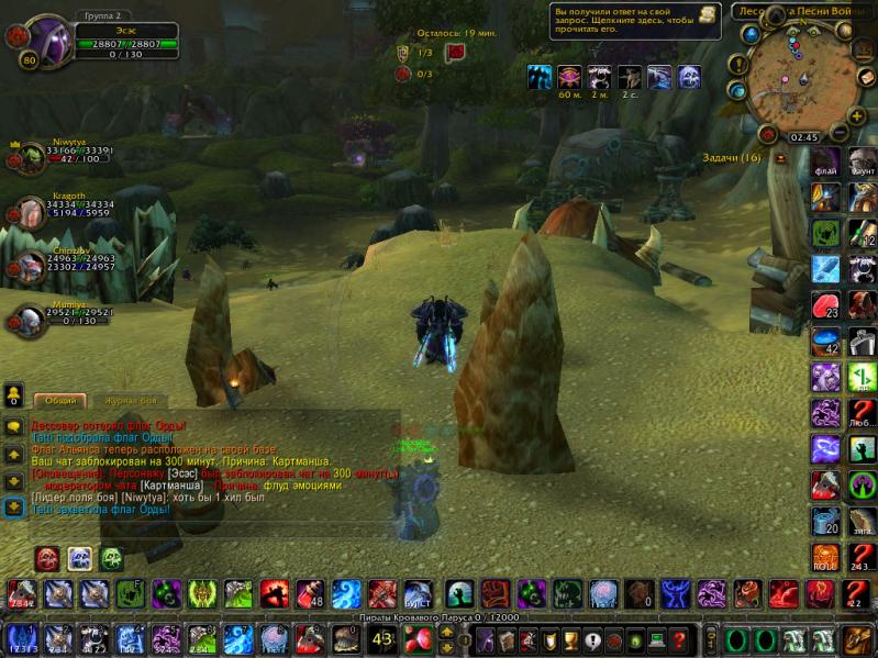 Ночное бг 2:45 , чат совершенно пустой , я увидел в противниках Картманшу модератора , я если честно немного недолюбливаю этого ханта и думаю что правильно делаю . В пылу боя перед гибелью послал 6 эмоций сообщений Картманше , послал бы меньше но бой все дела , опять же напомню чат совершенно пустой ночь , за что мне дал этот модератор 300 минут мута..... почитал - мут за подобное 30-60 мин , это если народу много в столице кричать , по мне так это превышение полномочий WoWScrnShot_072513_024518.jpg хз как вставить скрин если надо , ЛК25 дк Эсэс