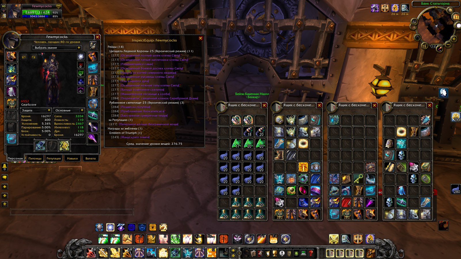 Оригинал сообщения:Немного о чаре. Паладин почти биc во всех спеках. Рпал предбис. По поводу ачив, нечего не могу сказать, там все печально). В общем то сразу к делу, все будет видно на скринах, по надобности покажу в игре. ПЕРСОНАЖ НА ПОЛОВИНУ ЗАДОНЕН.