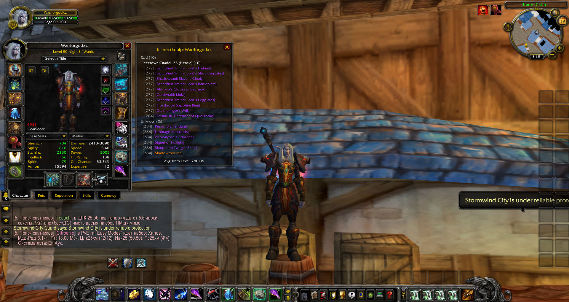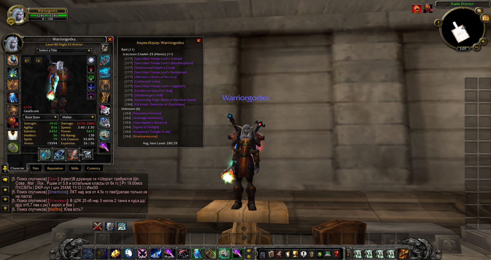 Воин (Warriorgodxz), фул бис фури, так же есть хорошо собранный прото дд, есть зов хаоса гер и щит гер, 6,4 в танке. Огромное количество редкого и доначенного трансмута, среди них фул т3, ледяная скорбь, ашбрингер, дабл иллиданки, две пвп накидки (разгневанного и неумолимого гладиатора) и т. д. Наиграно около 50 дней., из проффесий - ювелирное и инженерное дело.