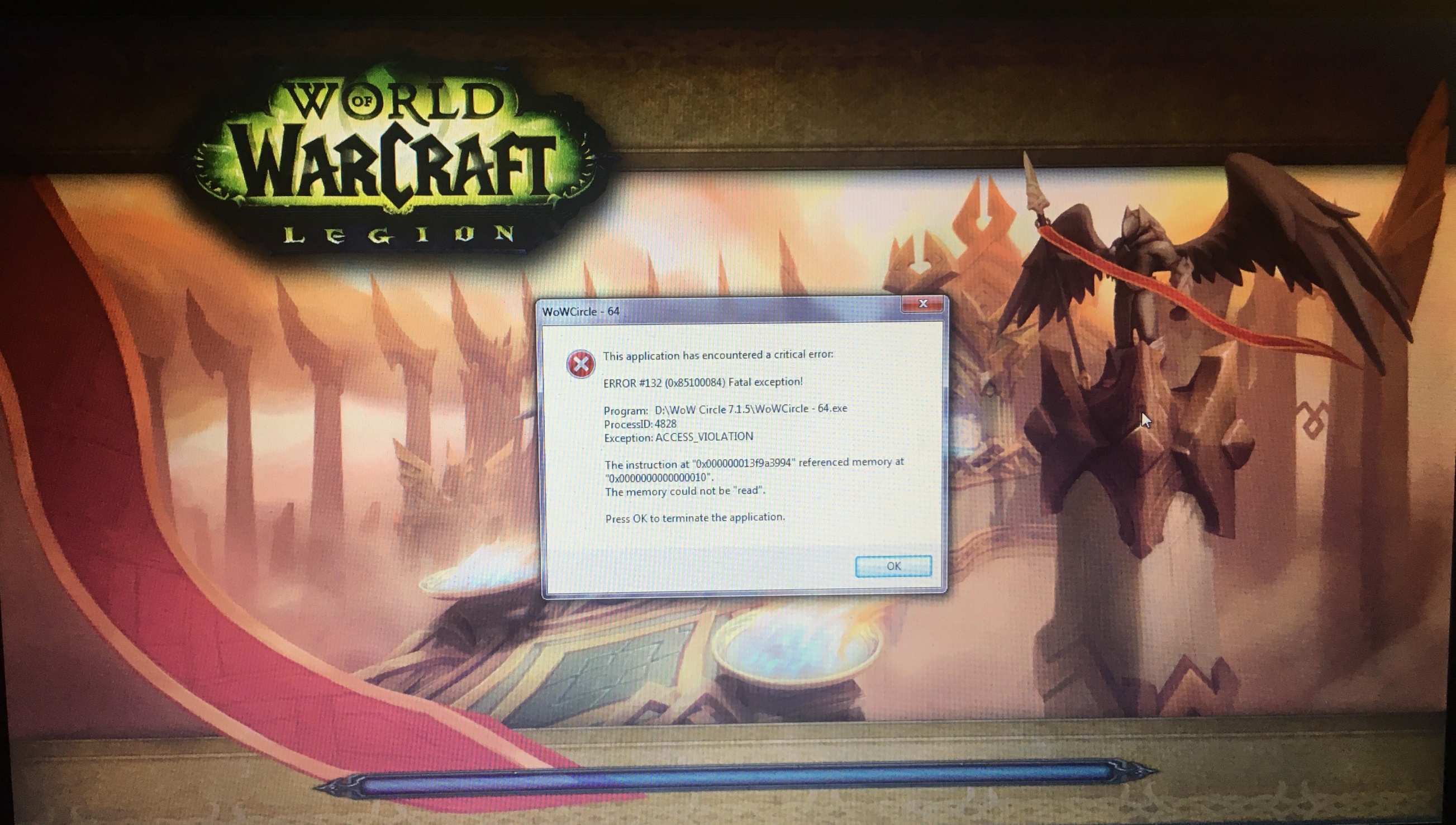 Портанулся в Даларан и прокнуло ПП потом завис, перезашел и все время выдаёт ошибку и закрывает игру
