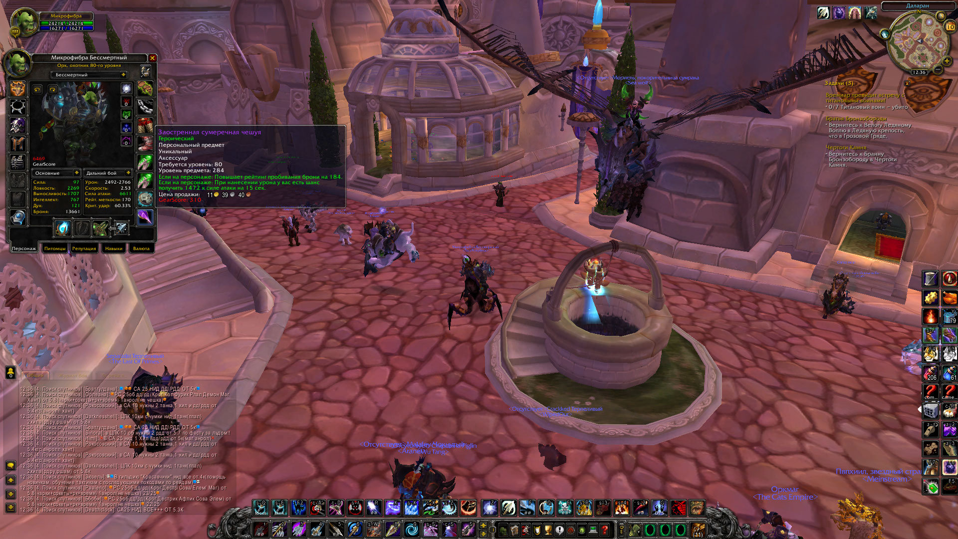5.9 страниц маунтов, фул профы(первая помощь, кулинарка, рыбалка, инжа, портняга) со всеми рецептами, 7640 ачив, много вещей в банке на трансмут, есть 2а8 ноги руки со склепа, чар готов для рейдинга, для пвп не готов(нет даже медальона), около 50 титулов(бессмертный, неумирающий). Обычка только спина и кольцо из шмота