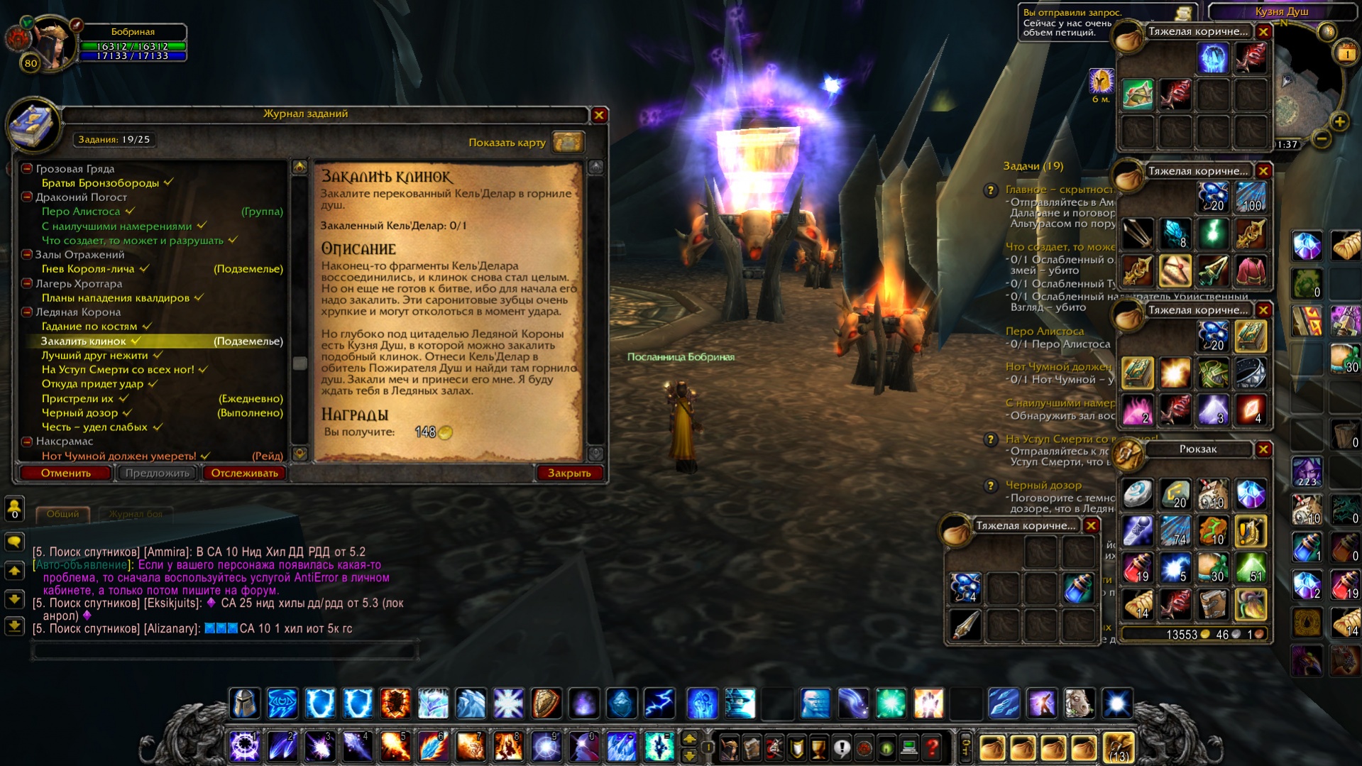 Выполняя один из квестов "Потертая рукоять", а именно "Закалить клинок", удалился предмет "Перекованный Кель'Делар". Зашел в "Кузню душ" и нажал на предмет, по глупости, после первого босса и он выпал из инвентаря (Осознал что не там, найти не смог). Прошу Вас восстановить предмет, так как утерян он по случайности и прерывает квестовую цепочку. Благодарю Вас! Скрин инвентаря и квеста прикреплен