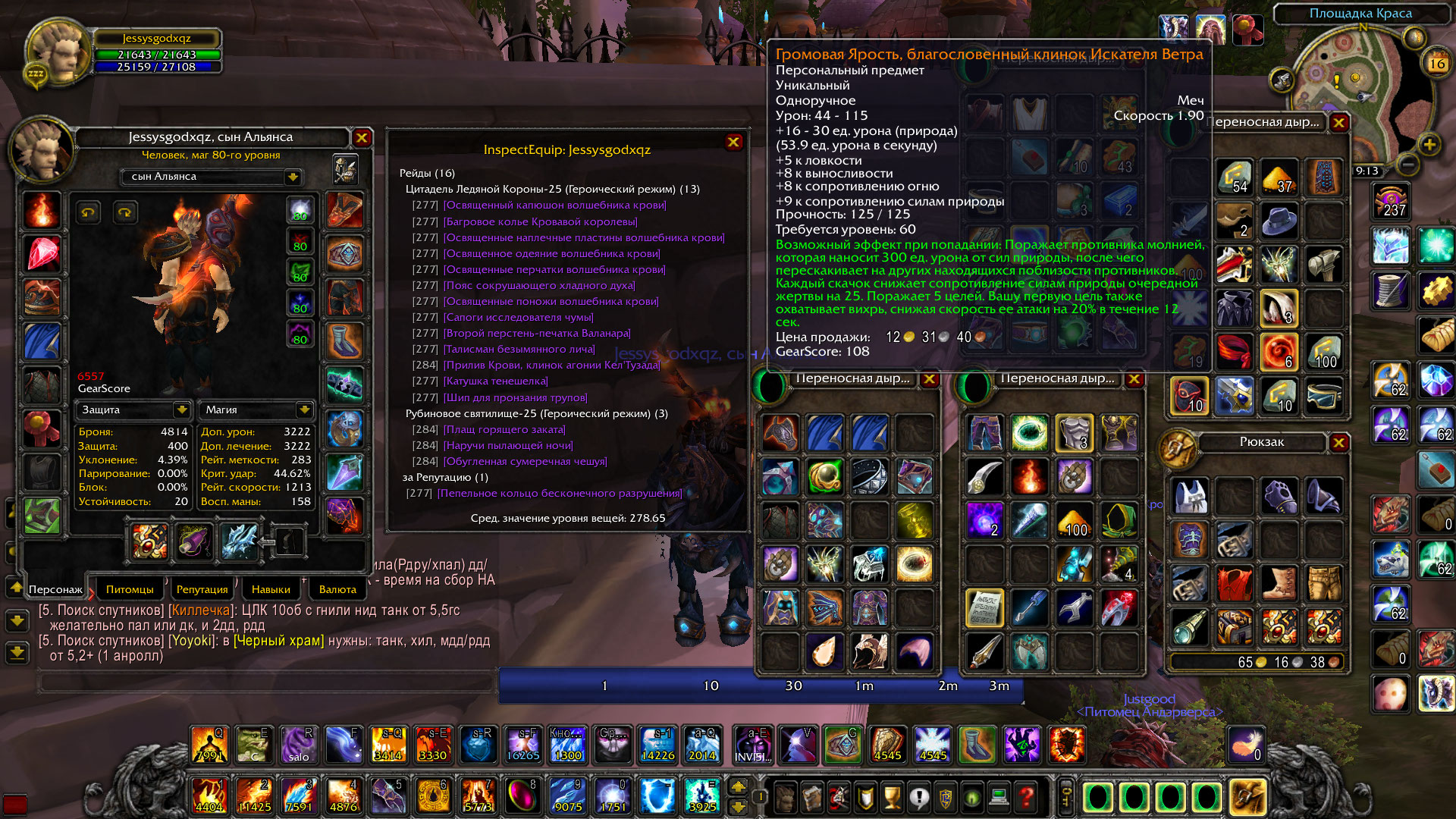 Скрины персонажа (не менее трех!!!), на которых видно ваши вещи, открытые сумки, достижения и т.д.,