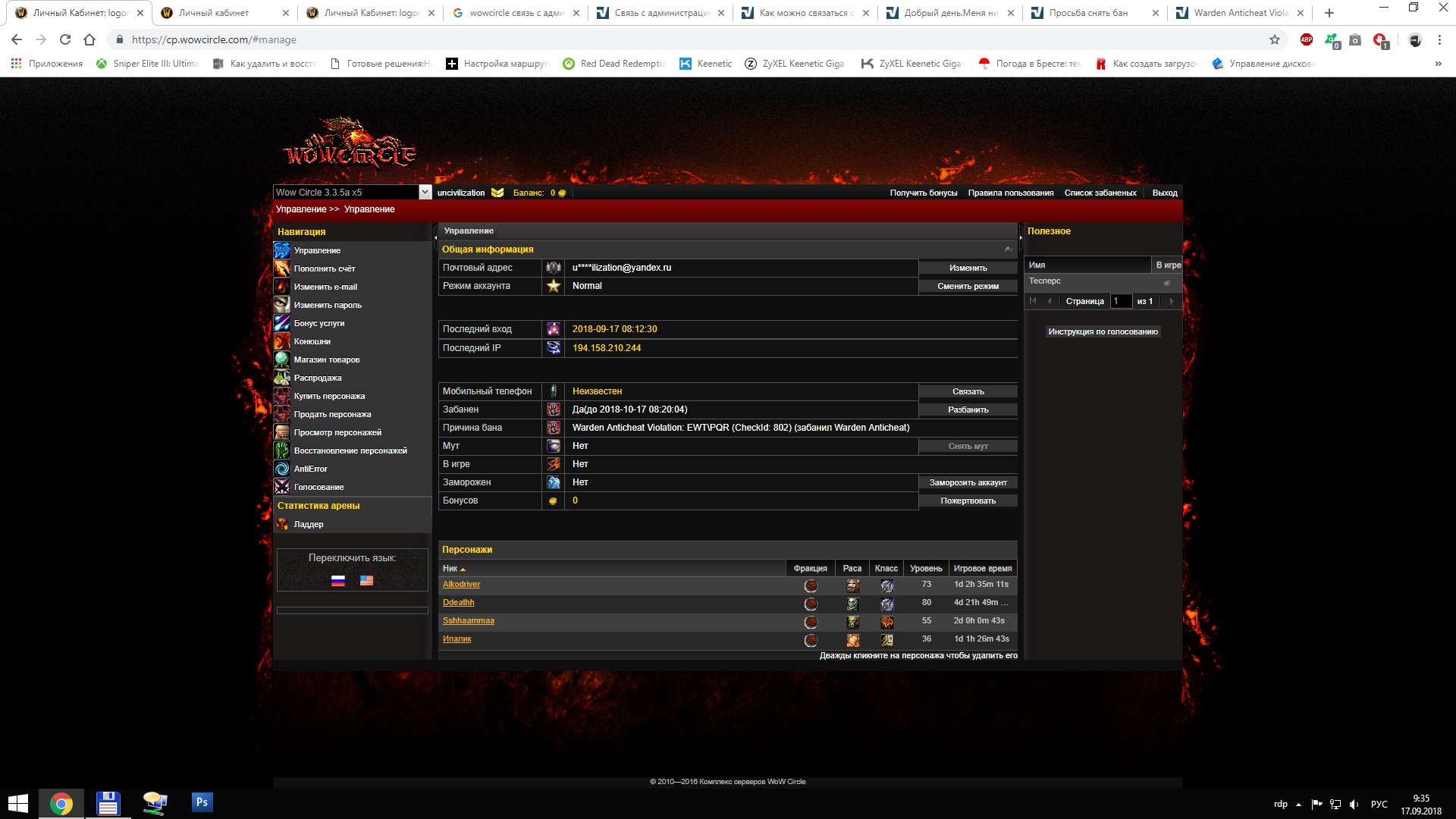 Добрый день.Все время что играю на вашем сервере все было замечательно до сегодняшнего утра.Решил подключиться поиграть сегодня и 5 мин. в игре не провел как меня выкинуло и войти не дает.Пишет вы забанены. Текс такой Warden Anticheat Violation: EWT\PQR (CheckId: 802) (забанил Warden Anticheat).Никаких програм, а тем более читов не устанавлявал.Аддоны ставил только с проверенных сайтов. Запрещенные аддоны не стоят. Прошу меня разблокировать. Спасибо за понимание.