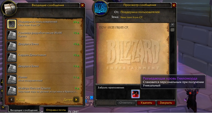 Доброго времени суток. Купил за 32 бонуса https://ru.wowhead.com/item=50231/ра...ломорда, пришла быстро, но забрать не могу с почты. Кликаю(ПКМ), в рюкзак не падает. Это проблема решится со временем сама или это что-то более серьёзное?