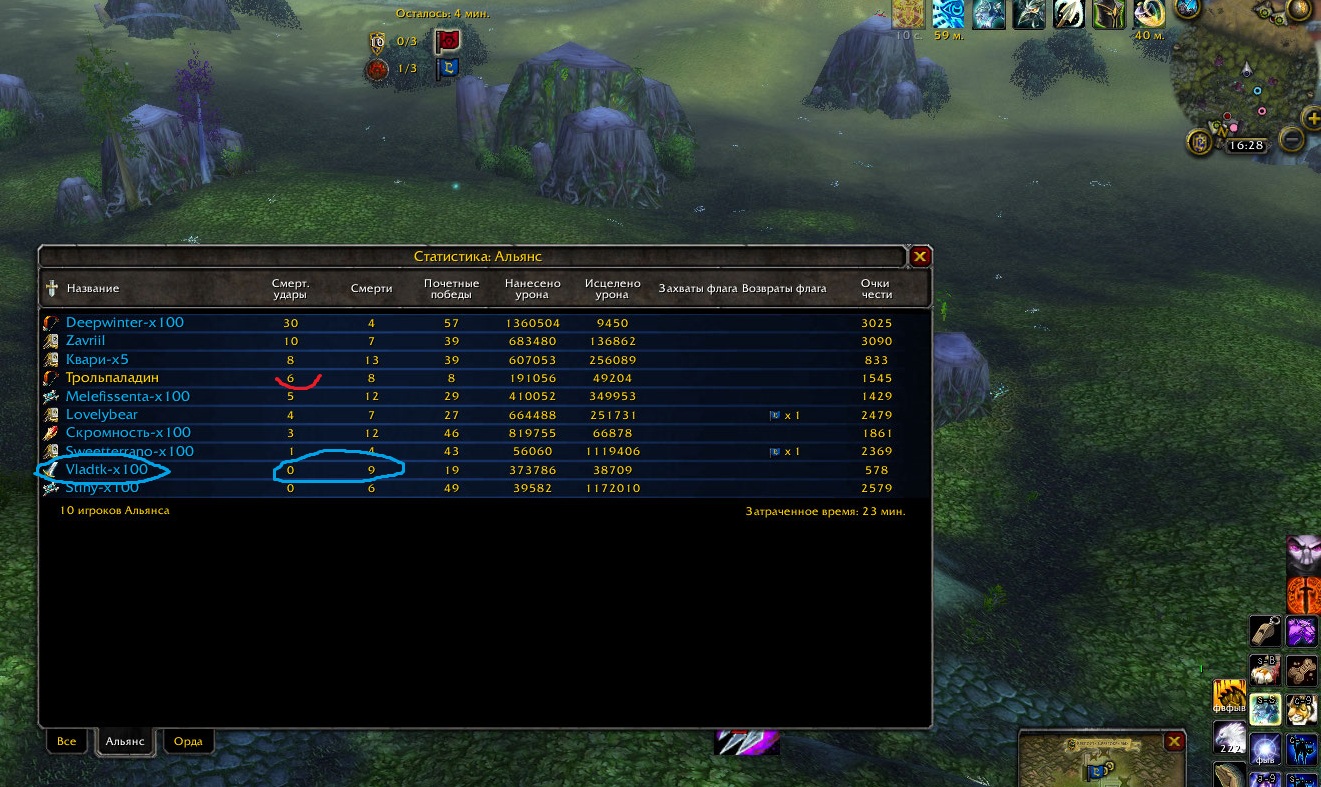 После этой угрозы, на видео в конце ВИДНО я начал играть. Отыграл всё БГ до конца и принёс пользы больше, чем этот человек, который только и делал что писал херню в чат, стоял на холме кладбища и умирал там же, пока писал мне угрозы в чат и строчил на форуме. У него только смерти увеличивались от афк. А я играл. Статистика боя: