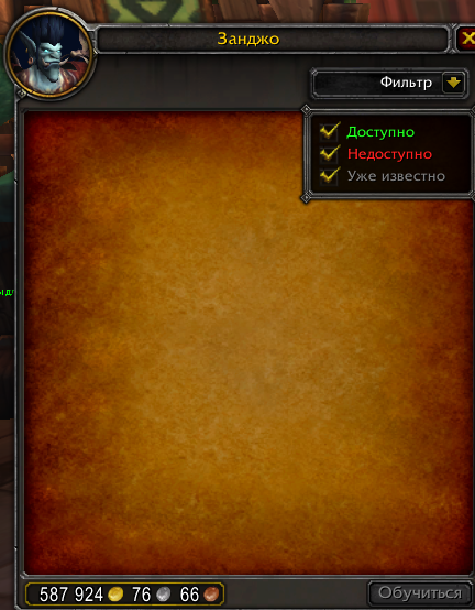 2. Невозможно изучить рецепты профессии Зандаларское Кожевничество (Орда) поскольку они не отображаются в соответствующем окне