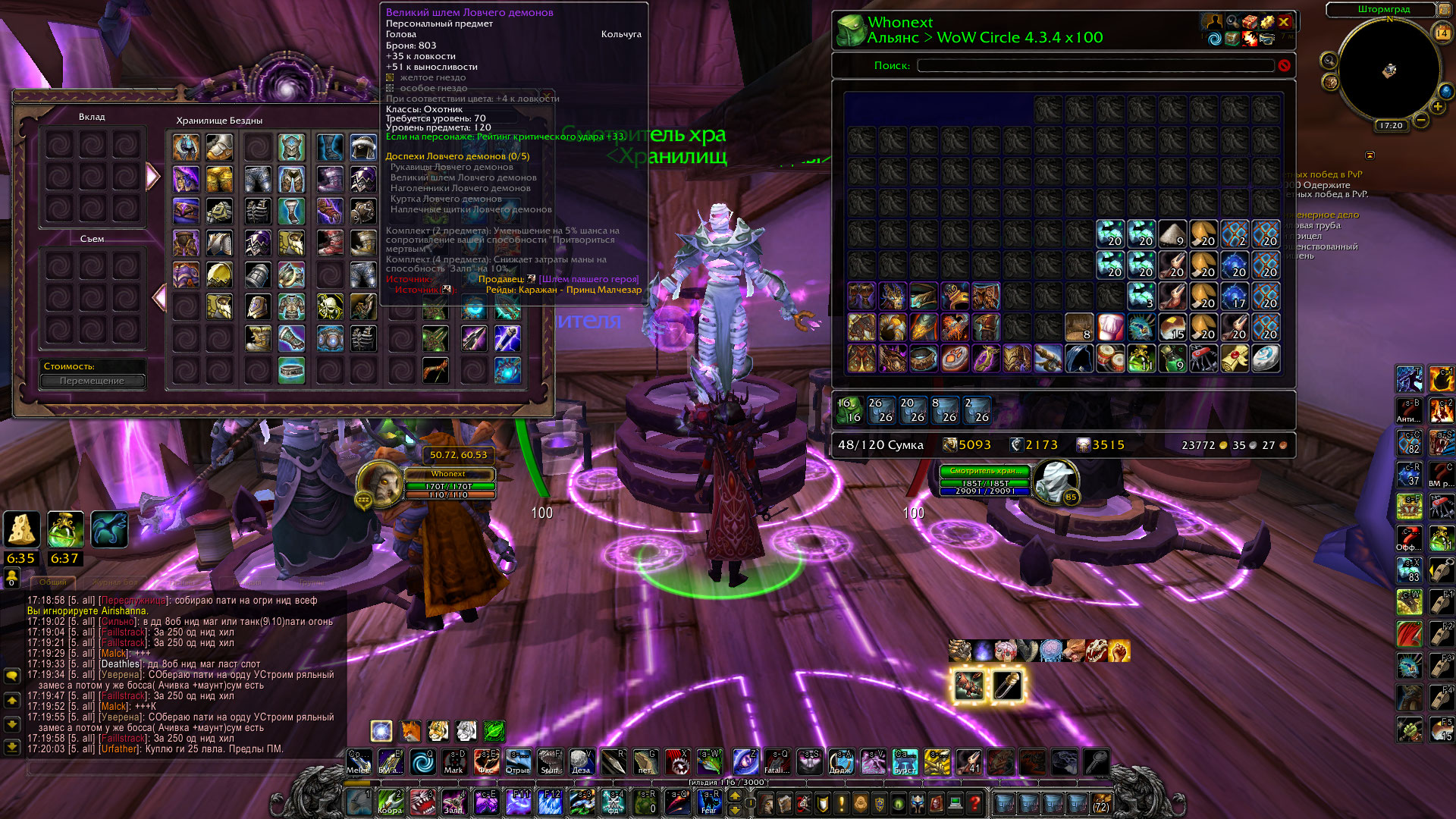 5. Шикарный хант, 52 звания, 157 маунтов (в том числе и донатных, скрины некоторых из них смотрите ниже в комментах), 158 спутников (много донатных, лень было скринить всех, покажу в игре, если требуется), куча трансмога (в том числе, недоступный в игре сет А9, донатные накидки и несколько крутейших сетов), фул сет т2, ачив 2000 в 2х2 и 2200 в 3х3, ачив 85 лвл 2012 года, 73 дня наиграно. Все профы вкачаны на фул (в том числе и побочные).