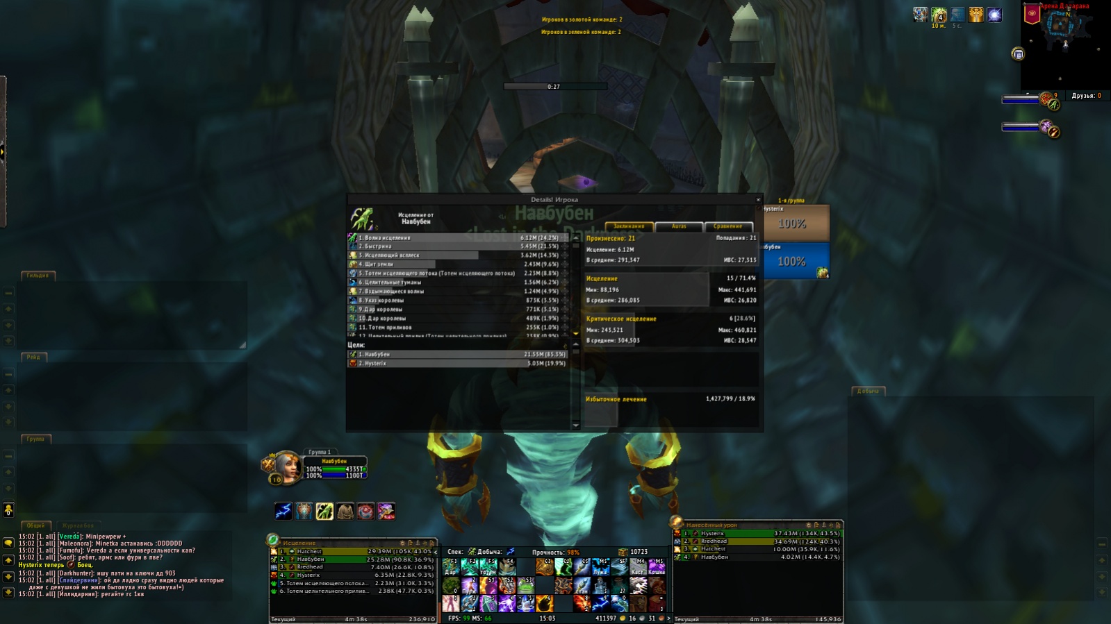 2. Полостью не рабочая искусность в пвп, шаман хилит на фул хп исцеляющим всплеском 250-400к, волна исцеления 200-400к, на лоу хп цифры аналогичные.