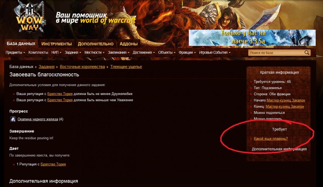 На WoWCircle Cata x1 вся репутация за кв и все привязки с версии Лича, но если честно - в этом мне Ваш сервер нравится больше =) Вот только прокачать репутацию дальше - невозможно. К нпц в БРД нужно приходить уже с уважением.