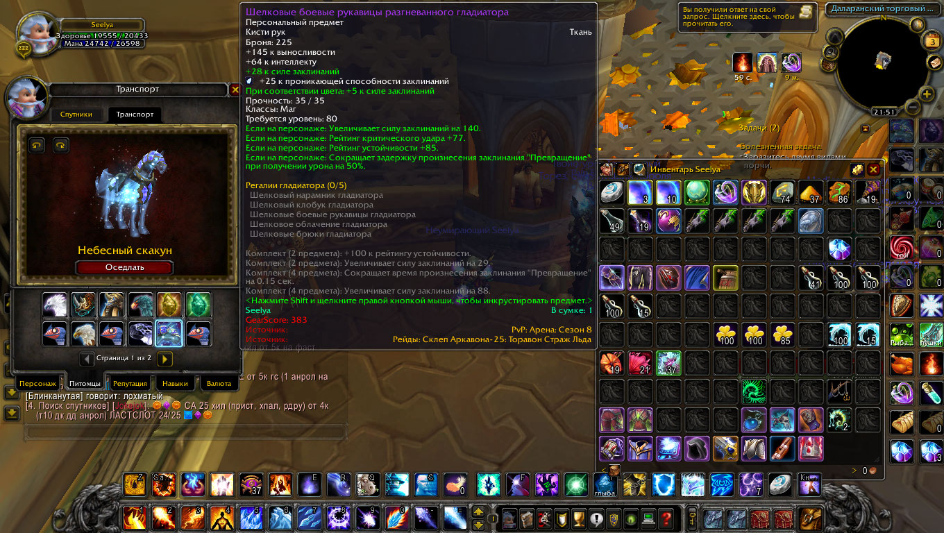 5.Есть красивый трансмут, звания, небесный скакун и другие маунты, выдает красивый дпс будете всегда вверху списка выставляю в лк если вопросы пишите.