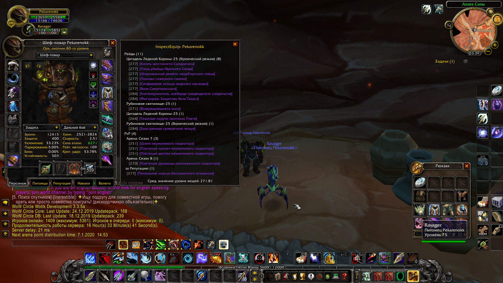 Pekarenokk орда ,отличный хант для пвп. 2/5 а8.Почти весь бис пве нонсет. Нонсет ноги есть. 30к хк .Инжа и портняга фул вкачены.Из маунтов есть непобедимый и киражский танк.