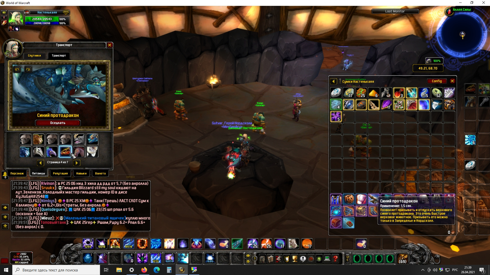 3 страницы питомцев, в том числе протодракон, коротышка и т.д. 7 страниц маунтов, в том числе механоцикл, синий протодракон, стремительный белый крылобег, тундровый мамонт путешественника и т.д.