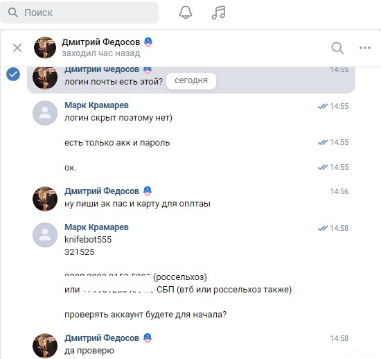 Предложили купить аккаунт с персонажами, отправил данные от аккаунта, попал в черный список, конец истории.