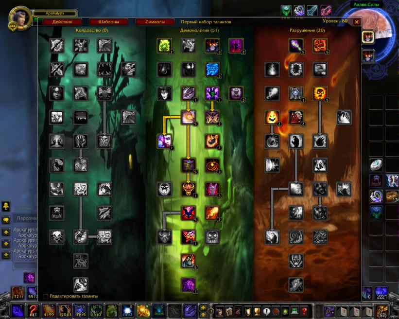 Не буду подробно расписывать о классе «чернокнижник», расскажу некоторые моменты: – Афли ветка делает акцент на фир, проклятия (доты) и высасывание ХП , Дестро ветка ориентирована на бурст , демнолог же это дамаг в чистом виде . Скажу сразу , демонологом реально убить 1х1 любого дд . С хилами намного сложней , но и их слить реально .