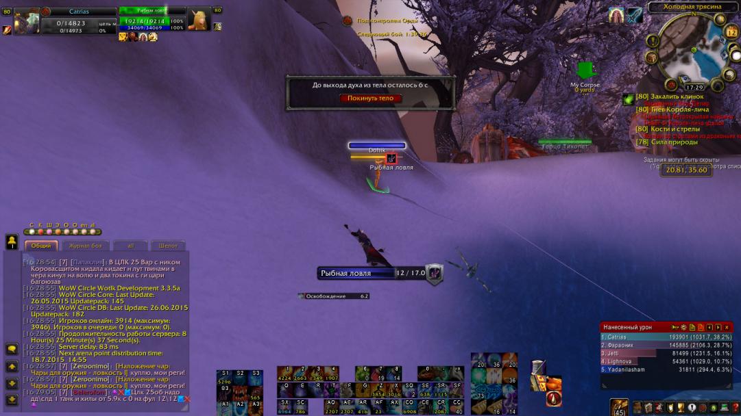 Данный игрок в течение 20 минут моего наблюдения бесперерывно рыбачил, не отвечая ни на одно мое сообщение, 3 раза умер. На первом скриншоте, после моей смерти дк начал его бить, но паладин продолжать закидывать удочку. На 5 и 6 скрине показано, как меня убивают, а паладина не трогают, хотя оло - пвп зона, и он уязвим. Скорее всего, его защищают от лишнего внимания, я умер рядом с ним 3 раза.