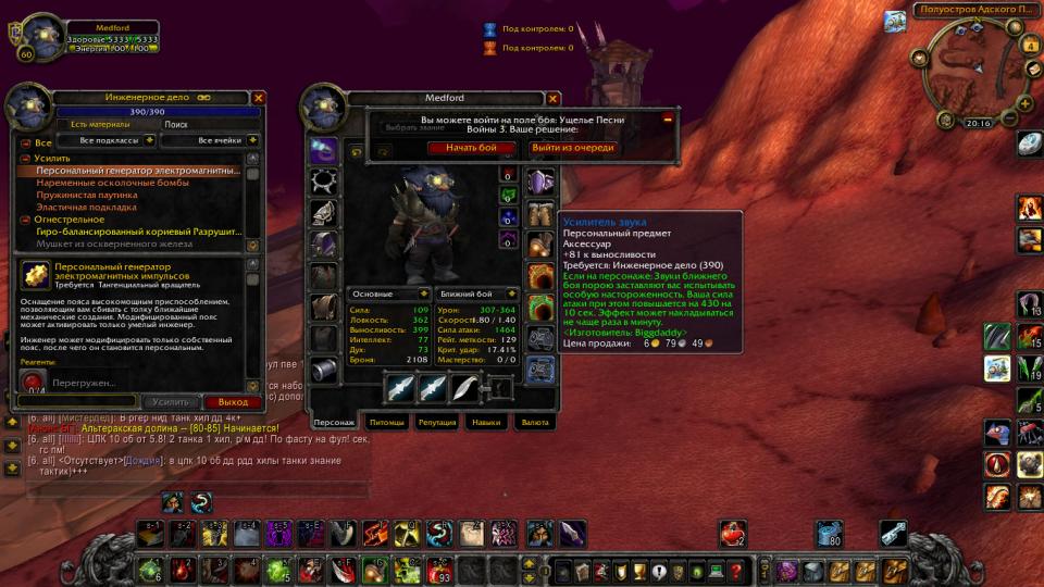В довершение ко всему, оказалось. что я зря создал именно гнома - Специализация на инженерном деле (+15 к профессии, что позволяет уже с 50 лвла одевать лк-трини Генератор Шума и Усилитель Звука) - НЕ РАБОТАЕТ НА БГ (бонус к навыку сбрасывается, а трини, будучи надетыми и вовсе исчезают), Что, как и почему - здесь у меня нет ответа