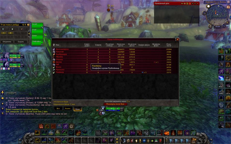 Скриншоты были сделаны в течении короткого промежутка времени с интервалом не более 3 секунд, поэтому заметно, что местоположение игроков Альянса на карте поля боя и миникарте (в правом верхнем углу экрана) изменяется только слегка, а предвежение нарушителя с флагом происходит быстро и целенаправленно....