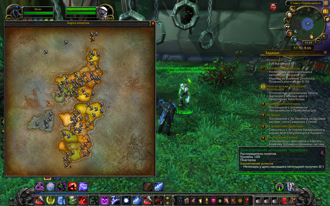 2. Задание дает Старший аптекарь Шана Т'вин (http://ru.wowhead.com/npc=44784) у негоже и сдается, он посылает нас к Дрессировщик нетопырей Червебрех <Распорядитель полетов> (http://ru.wowhead.com/npc=44825), мы с ним должны поговорить, что бы он посадил нас на Нетопыря (http://ru.wowhead.com/quest=26998#screenshots:id=460887), этого не происходит, при клике мышкой на Дрессировщик нетопырей Червебрех открывается карта полетов.