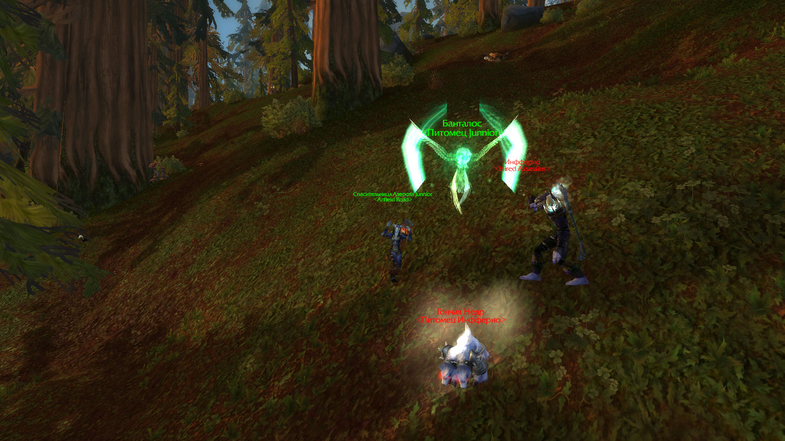 3. После приручения Мертилак я сделал еще 1 пошел по Хиджалу и тут же у меня зазвенел НПС скан и сообщил о том что вокруг меня летает призрачная сова - "Банталос", поняв его маршрут (Он летает вокруг Святилища Малорна) я приземлился на макушку ближайшего дерева, сагрил его своим петом и сделал несколько выстрелов, дабы принять агро на себя. Быстренько прогнав своего пета и кинув замораживающую ловушку под себя я стал приручать данный экспонат, стоит отметить что вокруг меня летал еще 2 охотника со стороны Альянса и Орды. Но никто мне не помешал, либо не смогли помешать.