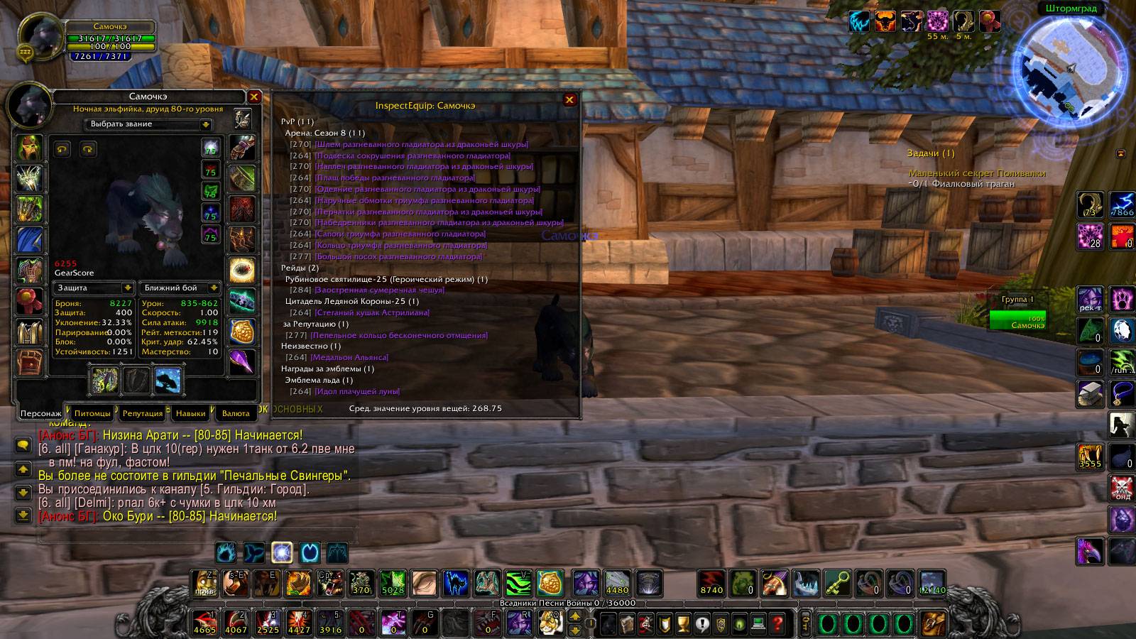 1. Самочкэ, друид, альянс, ночная эльфийка. Пве 6.5 ферал бис (не хватает ток пояса гер он обычка но эт фигня=) ), ферал пвп а8, сова 6.5 бис, хил а8, хил 6.5 пве, есть также частично шмот на танка 6.2 пве
