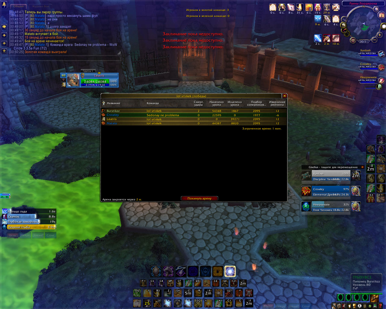 ;D а против энха то мне зачем кнок?слаер забущеный дурачек, который от меня по кд получает,что магом, что шаманом, что локом, а вы слили на 1 тиму))) сливали примерно на 2.1, ночные ривалы.вы убили нас за сек 10 после открытия, потому что мы прослакали, вот я и спросил зачем такое скринить. Вы начали лить ещё на 2060 примерно так.