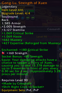 2 примеру уже указывал выше - один и тот же плащ Gong-Lu, Strength of Xuen одет на дк имеет 2.61 + Haste (3.16) на моём персонаже и ДОЛЖЕН иметь на ретри паладине 2.52 + Haste (но однако при 40% хасты всё равно показывает 2.52)