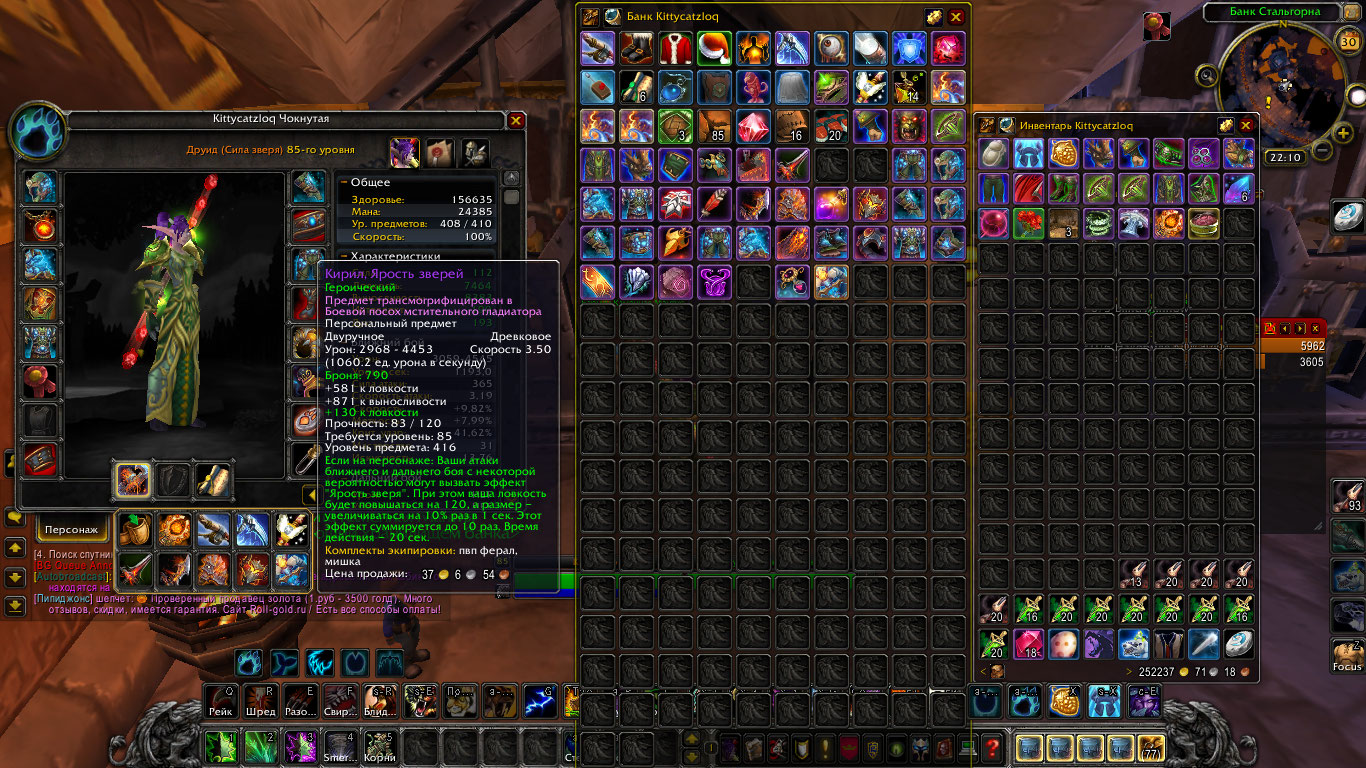 3. Всё видно по скринам, бис кот ( шея и плащ с оп имеются ), бис сова (шея с оп есть), почти бис рдру (пуха обычка). 7400 ачив (много легких не доделано, спокойно до 8000+ можно апнуть.