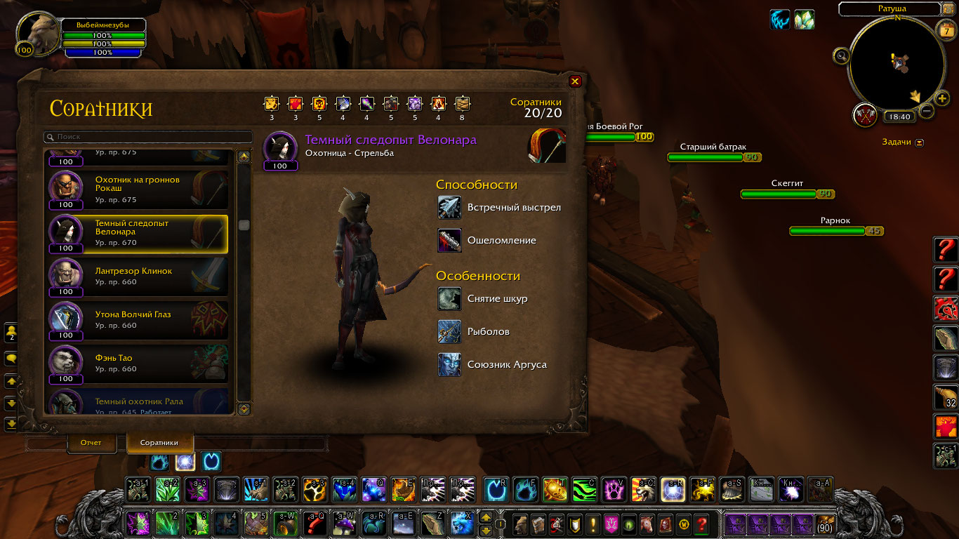 Соратники 14 из 20, 675 илвл, 4 из 20, 660 илвл, и два соратника 630+илвл на работке, фул 3 лвл гарнизона, кроме обитель духов.