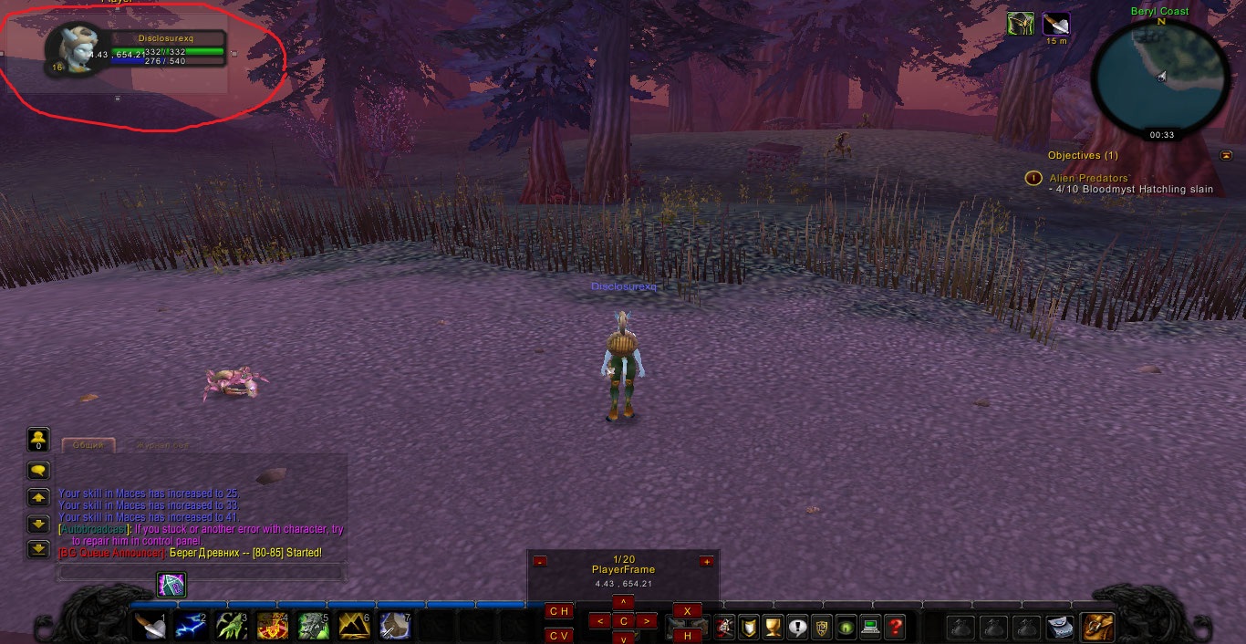 Теперь наводишь мышку на наш фрейм он же таргет (в левом верхнем углу иконка персонажа, кому не понятно) и нажимаем нашу кнопочку которую мы выставляли, у меня это F8.