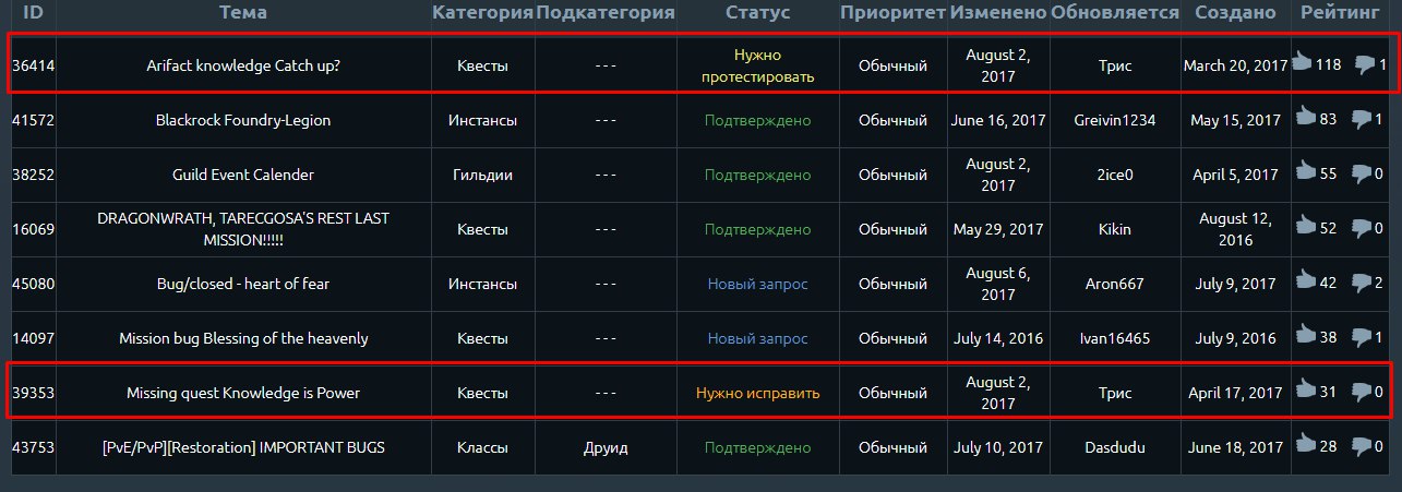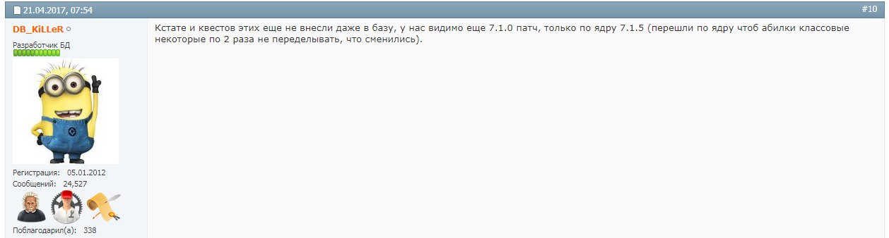 Так как на сервере потихоньку вводится ИК(Миф), игроков много и всем хочется его потрогать, а квеста на знание артефакта http://ru.wowhead.com/quest=46133 так и нет, следовательно, догнать старичков дано не каждому. Предлагаю следующее: поставить вендора с http://ru.wowhead.com/item=146745 и продавать каждый свиток по 1-2к http://ru.wowhead.com/currency=1220. Считаю, что данное предложение довольно логично, с учетом "охоты" добавлять данный квест на firestorm и невозможность реализации его тут, в связи с этим.