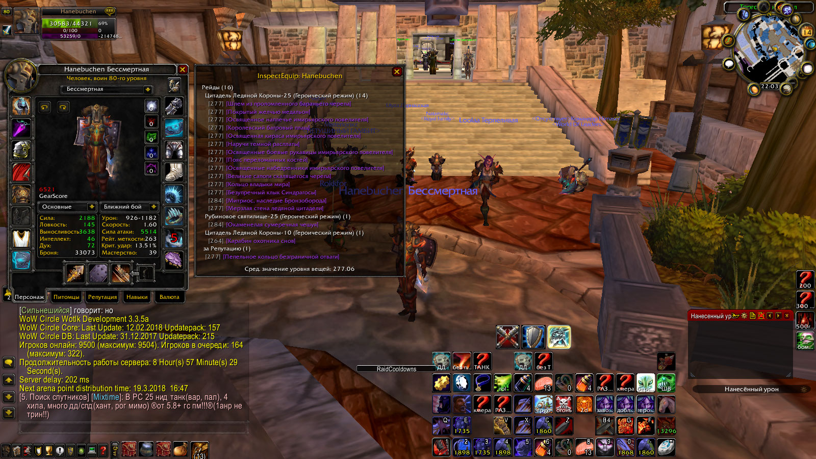 5. Неплохой вар 43 дня онлайн, из норм пвп обвеса пожалуй только поножи а8, так же присутствует 5я освященная т10(кисти), клинок с орка 25хм, гер сила гнили и гер кушак с профа(для тех кто хочет поиграться шмотом). Есть парочка шмоток на танка для Посланника Титанов (если точнее 2 трини, пояс и огнестрел. Маловато но главное начать