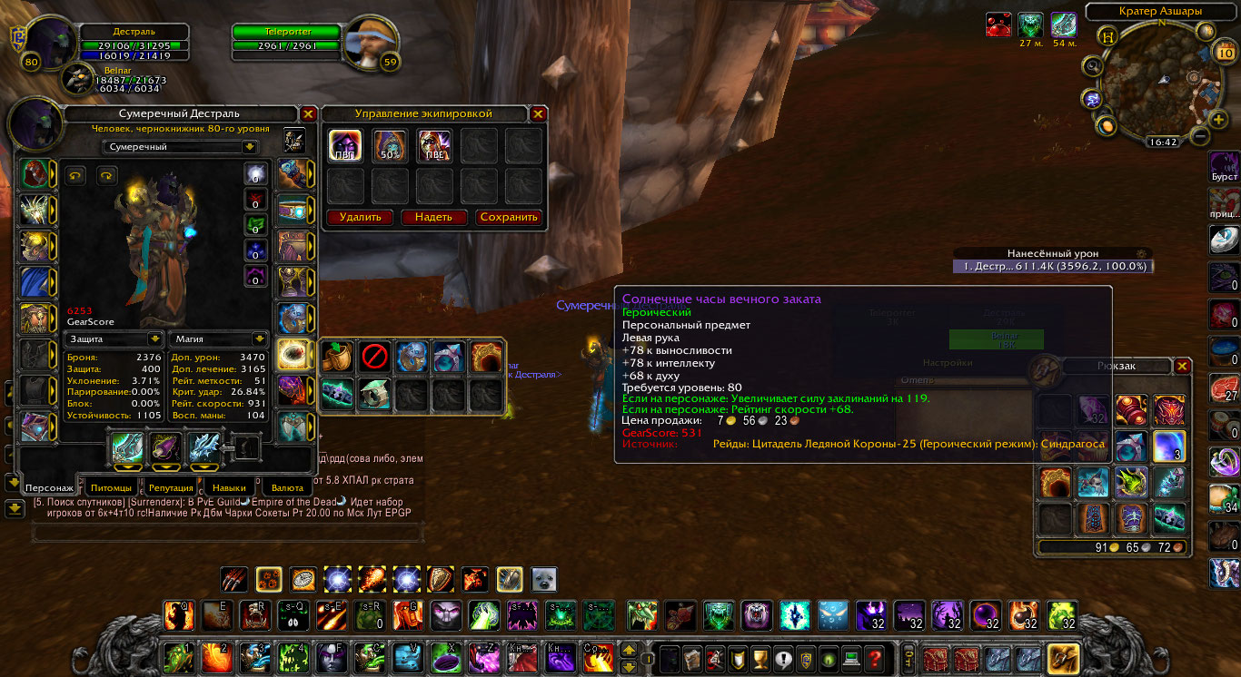45 дней онлайн , до биса тапки с цлк и плащ с рс , в пвп 4\5 а8 не хватает шапки , отличный лок для нагиба, 3 бис трини обьект талик и чешка, разные кольца , офхенд с духом , кольцо с духом, жезл .