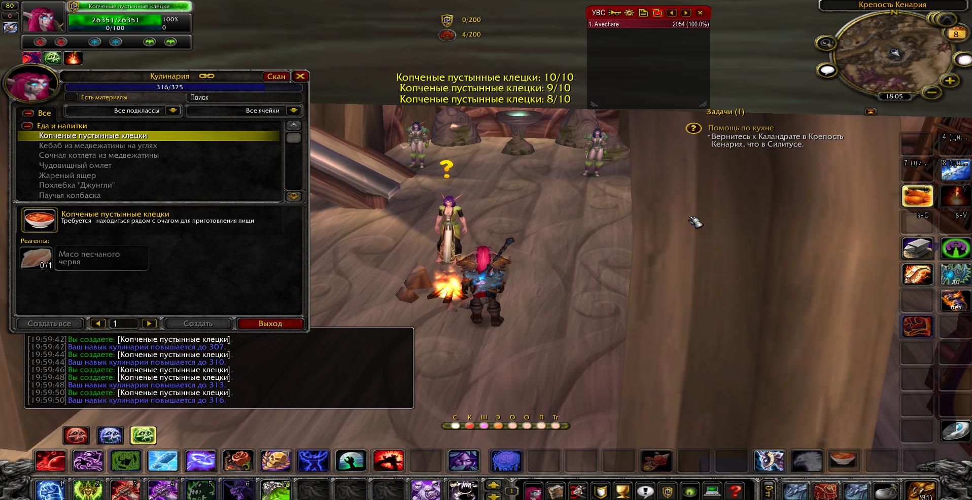 Теперь нам (альянсу и орде) нужно в локацию Оскверненный лес, каждый в свой лагерь за рецептом "Чудовищный омлет". Так же у нпс можно приобрести еще 2 рецепта, но о них позже. Гигантское яйцо выбиваем в этой же локации с моба железноклюв-крикун неподалеку от лагеря, попутно убивая мишек, собирая с них бок медведя. Чудовищных омлета получилось 6 шт и навык теперь 250/300. Изучаем рецепты, которые купили ранее и готовим "Кебаб из медвежатины на углях". Навык 289/300, получилось 18 шт. Обучаемся у тренера.