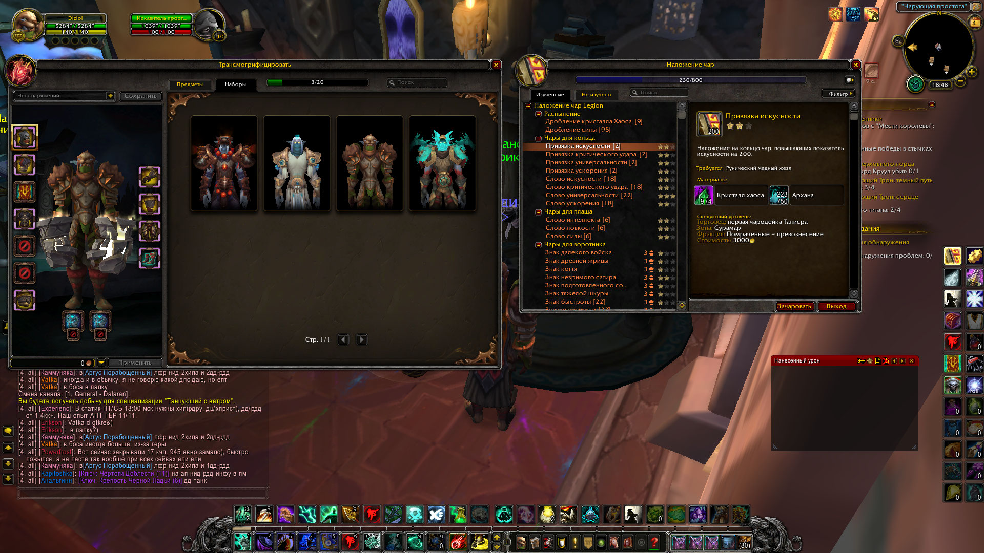 5. 4 комплекта транса+куча транса отдельно. Арт на дд 74, на танка 69. 4 шмотки из комплекта т21. Леги сефуз,пылкое желание кил'джедена,кольцо на танка, грудак на дд(конденсатор), кисти на дд, и бестолковое кольцо за квест с апт. Есть 2 трини с ласта апт(одна на дд, другая на танка) обе 945. 1 престиж. Профы инженерка(есть рец небесного голема) и инчат(выполнил цепочку кв инчатеров, так что многие рецы открыты).