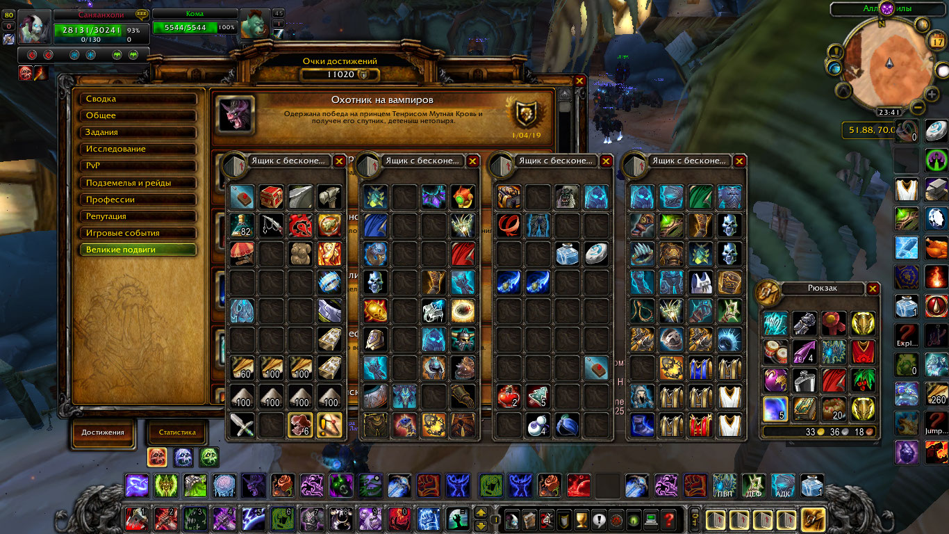 11 к ачив. 70 000 почетных убийств. 2700 рейтинга в 2с. 2400 рейтинга в 3с. т2 пухи всех вдидов. 40 великих подвигов. Сделан Военачальник, Хранитель мудрости. 11 страниц маунтов. В том числе и донат. сумки по 36 слотов. Донат трансмуты и тд.