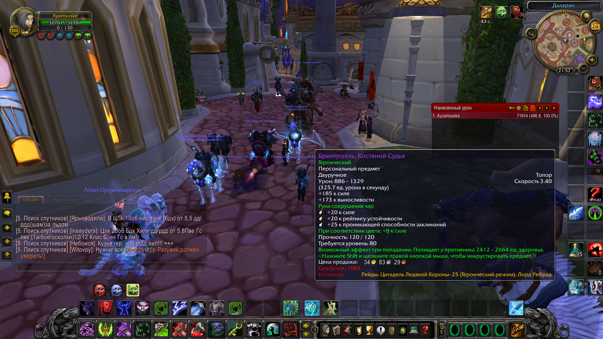 ник Ayzensoske, фракция альянс хуманша, есть все от пвп до пве! просто скажу по пухам тут т1 т2 шм бринтроль для фроста как пвп так и пве!" фул а8 дк с т2! 1550 реса !
