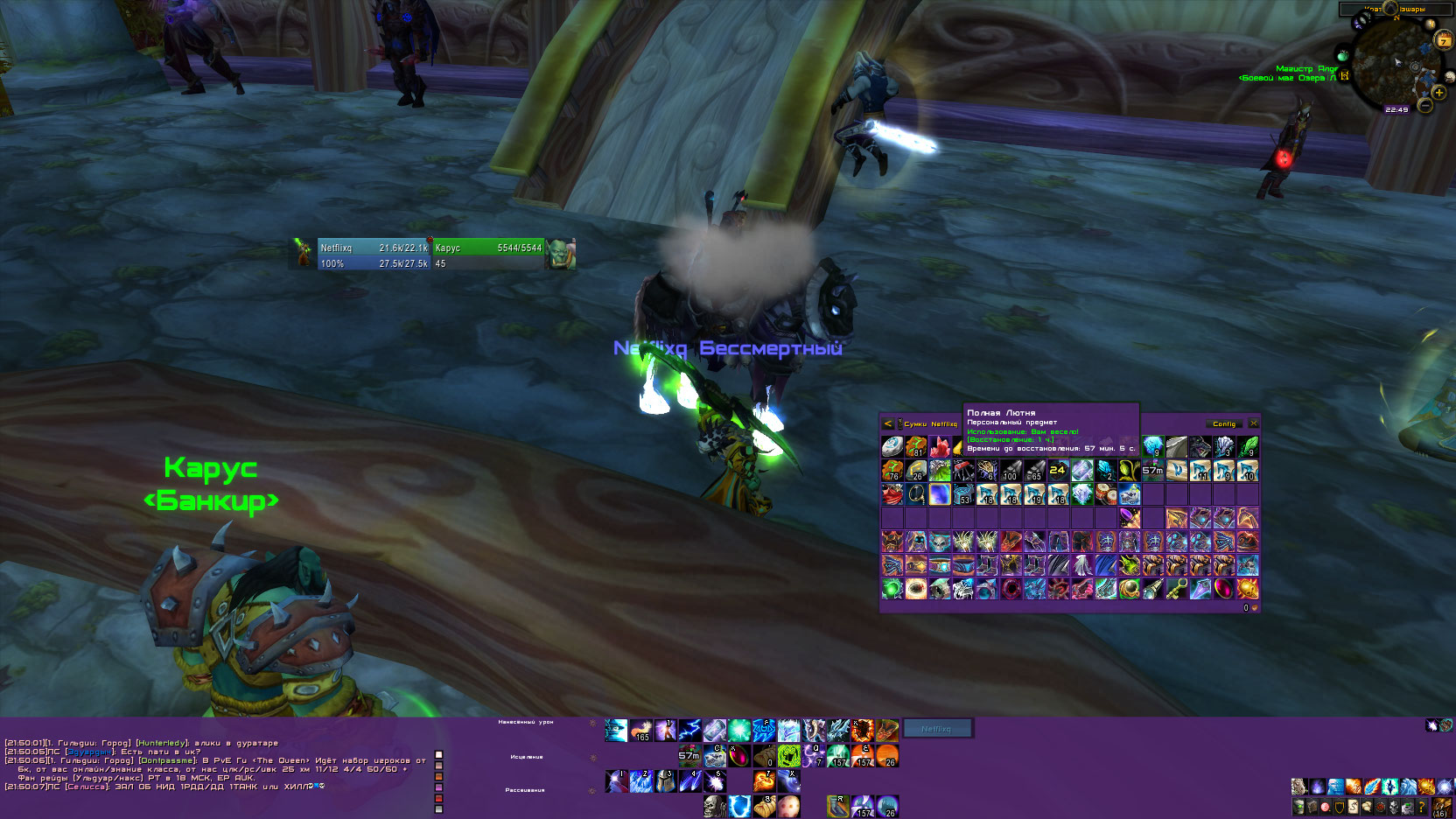 2.Бис пвп фрост, бис пвп фаер, бис пвп аркан, бис пве фаер, бис пве аркан, бис пвп фаер-спирит. Имеются все кольца, включая хаст+манарег и крит+хит, пве тело на крит+хит хм дублировано, все тринки, т2 одноручка на хаст, т2 посох на крит, Аркус, 2 Прилива ХМ, Нонсет на дух, крит, все виды оффхендов пвп и пве, все виды жезлов пвп и пве, Фулл т10 ХМ дублирован на фаера и на аркана, плечи а8 дублированы, имеются плечи на хаст+хит, также дублированы, есть НСка, солейс. Также на маге имеются такие игрушки, как лютня, метеоустановка и т.д.. Из донат маунтов имеется петух и мишка Близзард. Трансмогрифицирована "иллиданка" за коины. Имеется "иллиданка", закос под "иллиданку" и посох для транса донатные.