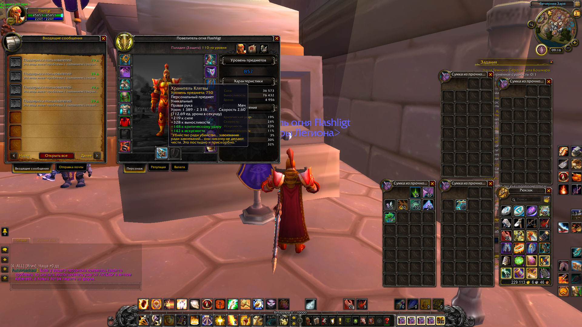 3. Меч (https://ru.wowhead.com/item=128867/хранитель-клятвы) должен надеваться вместе со щитом (https://ru.wowhead.com/item=128866/страж-истины&bonus=0). В сумках они являются одним предметом, и разделяются только на персонаже.