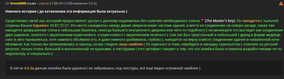 Nikolas_Gyks, Это не баг, а пасхалка от близзов. В патче 4.0.3 близзы её сами убрали. У нас патч 3.3.5а и соответственно тайный проход должен быть.