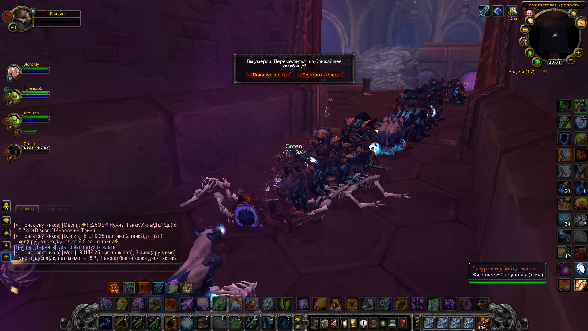 Зарегистрировался в случайные подземелья. Выпала аметистовая крепость. Зашел - у входа стоит орда мобов. Кто-то багнул инсту.