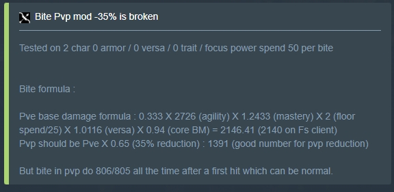 При тестах на маникене, по запросу информации у разработчика узнал что тот имеет 2700 брони, что эквивалентно ~30% среза физического урона, но по факту срезается всего около 3-5%. При тестах в ПвП на игроках, срез физ урона соответствует показателю брони надетой на цель атаки укусом.