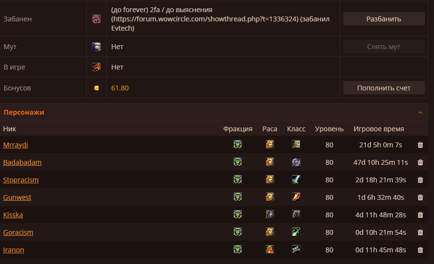 2.(до forever) 2fa / до выяснения https://forum.wowcircle.com/showthread.php?t=1336324 (забанил Evtech)