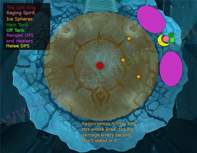 Беспощадность зимы - Как только Король-лич доберется до центра платформы, он использует это 2,5-секундное заклинание. Область в радиусе 45 м вокруг Короля-лича начинает мерцать. Все, кто в ней находится, получают огромный урон каждую секунду. Это мерцание продолжается 60 секунд до конца фазы.